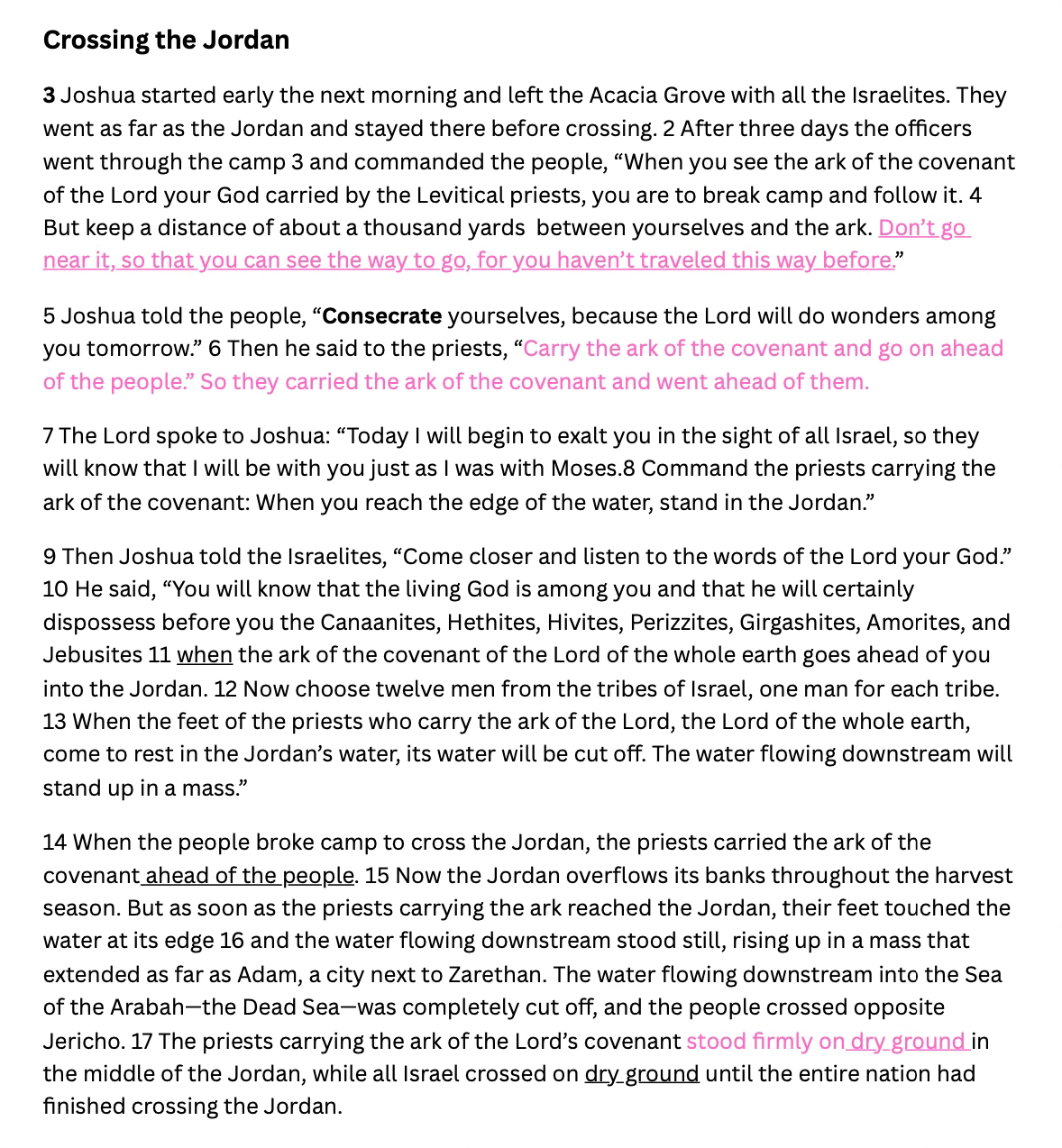 So today, I will be sharing a reading of Joshua 3. I don’t want to do anything related to God without praying about it, and I believe I was led to this specific passage for personal reasons and to draw a connection to last week’s prayer. Use the audio to hear me and read along below to see what I highlighted and underlined.